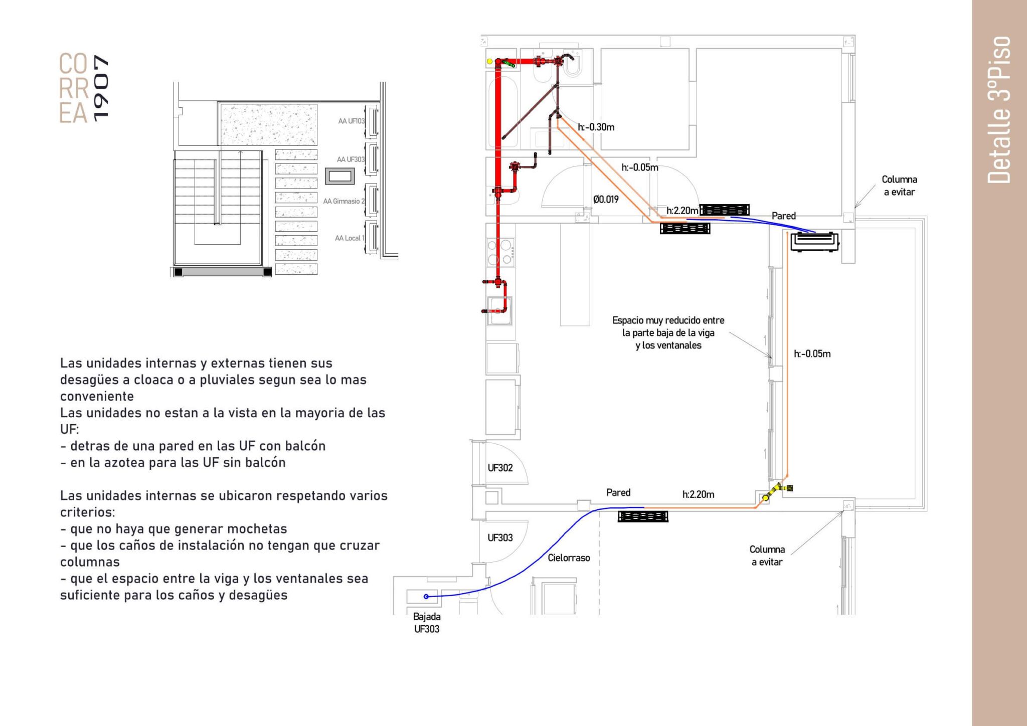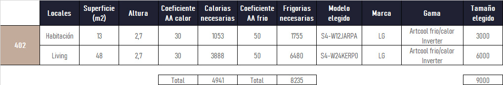 Todos los departamentos serán equipados de AA LG Artcool frio/calor Inverter, conectados de manera multisplit. El tamaño de cada unidad interior y de cada compresor se elegirá según cálculos