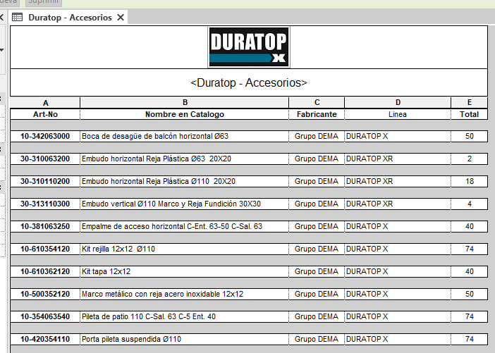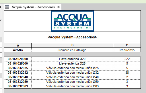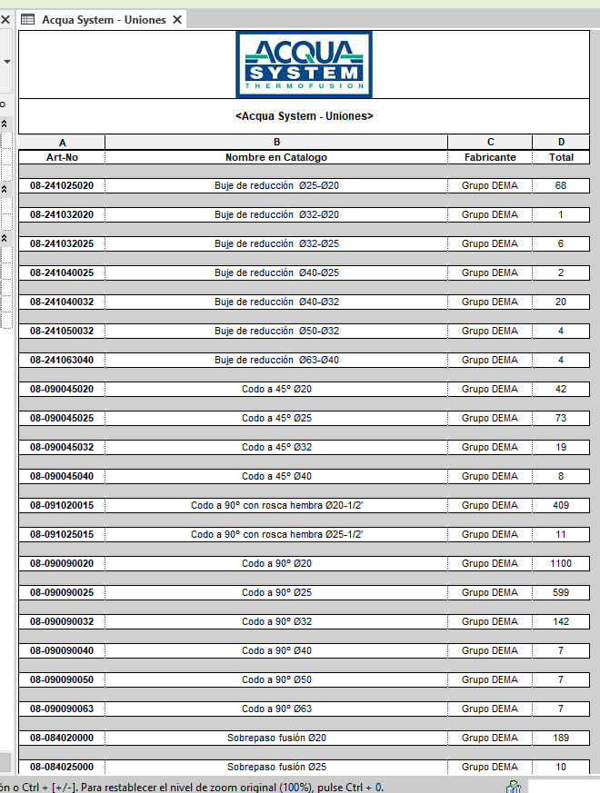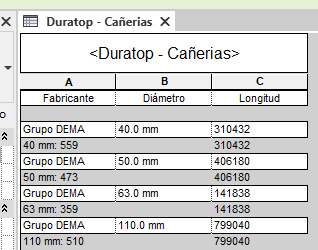 Las tablas de planificación de Revit, en este caso provistas por el proveedor (Grupo Dema), permiten realizar un computo y una compra detallada. La tabla de cañeria se puede afinar para realizar la compra definitiva, filtrando segun el largo de los caños (25cm, 50cm, 1m, 2m, 4m).