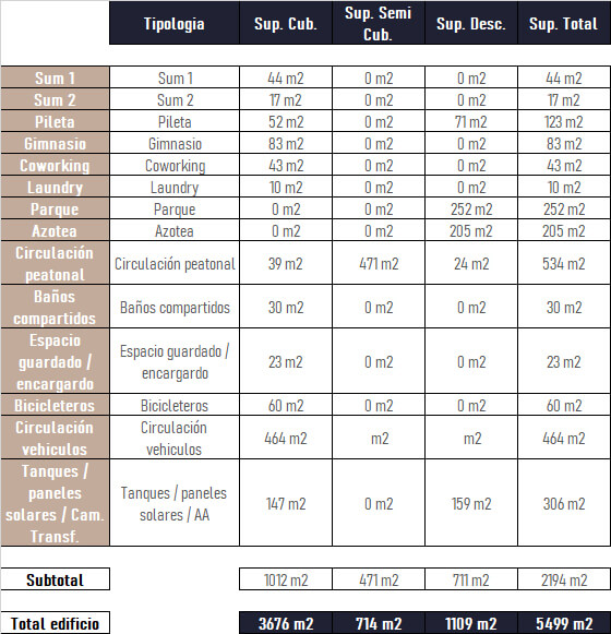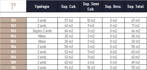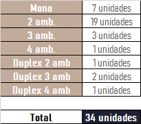 La repartición de las unidades según su tipología responde a varios criterios: Departamentos de dos ambientes o duplex para los solteros que ya tienen un cierto poder adquisitivo. Monoambientes para personas que no suelen estar mucho en su casa, o que incluso prefieren un espacio mas chico, sabiendo que el edificio ofrece amplios espacios para estar afuera del departamento. Duplex o tres ambientes para las parejas sin hijos que miran hacia el futuro o que prefieren tener un ambiente mas para sus invitados.